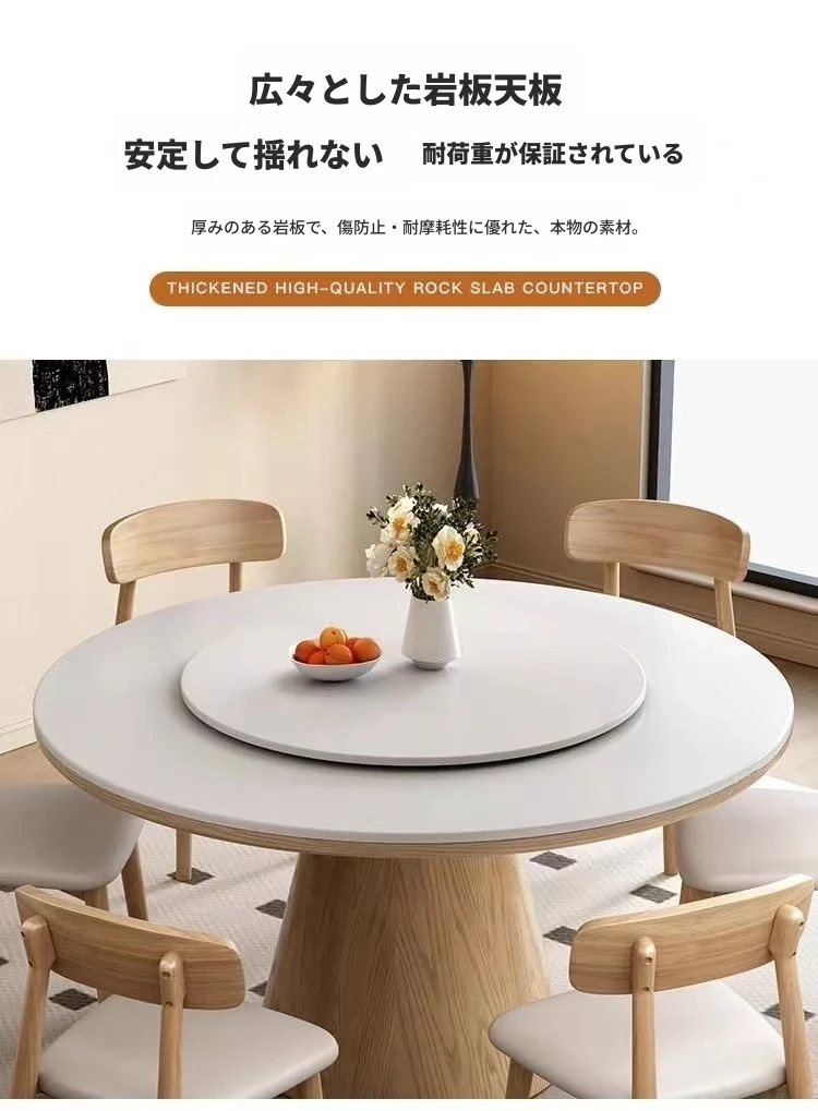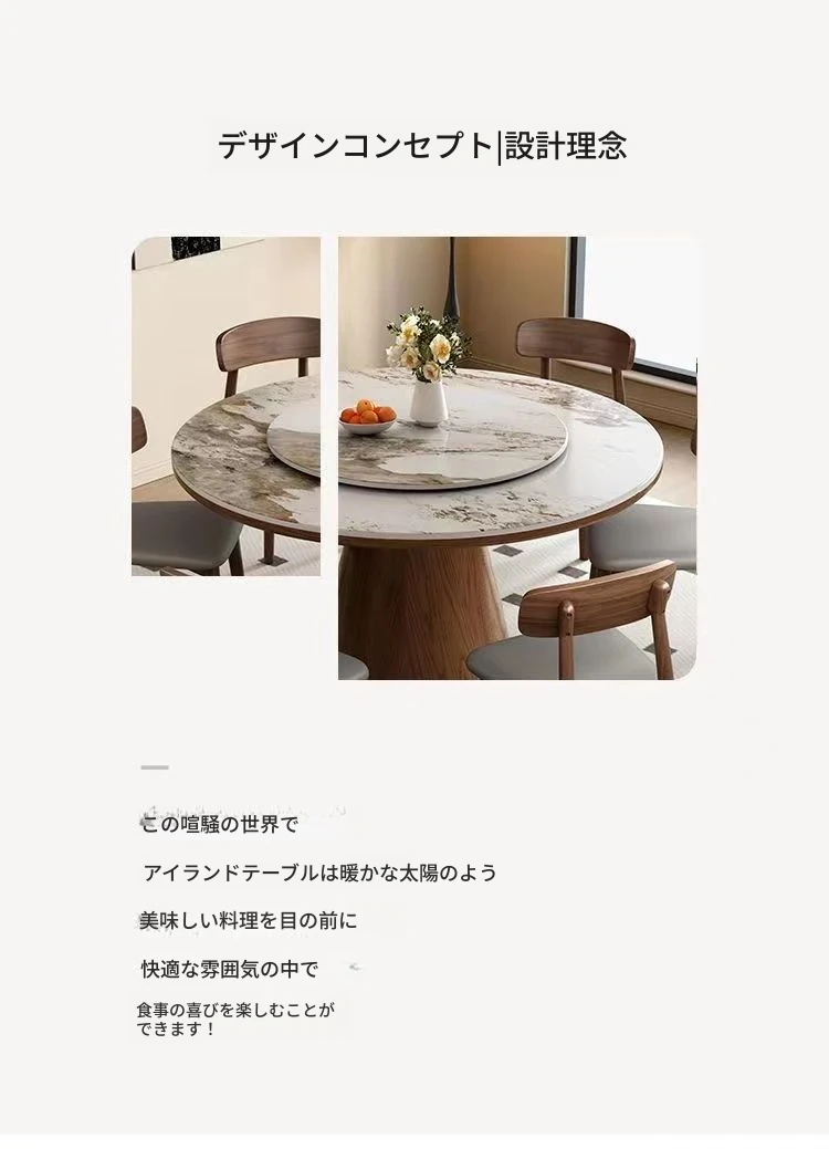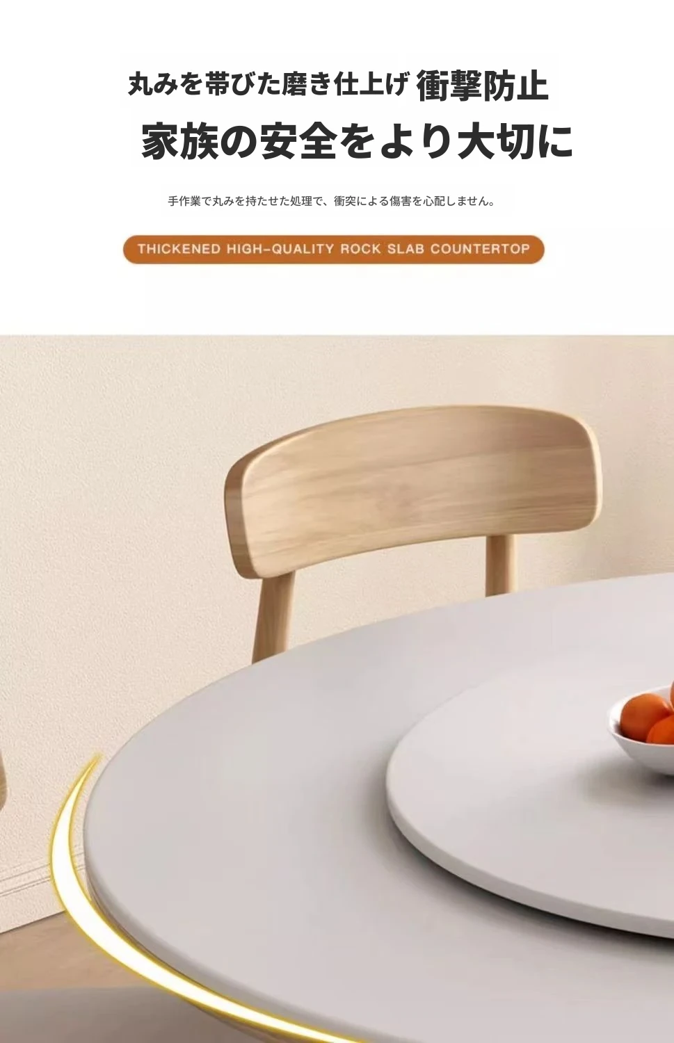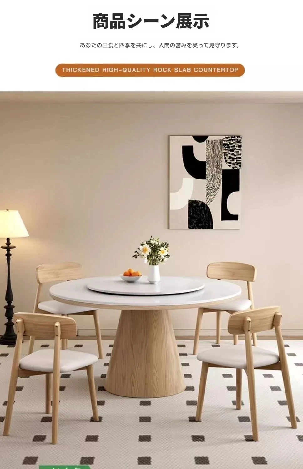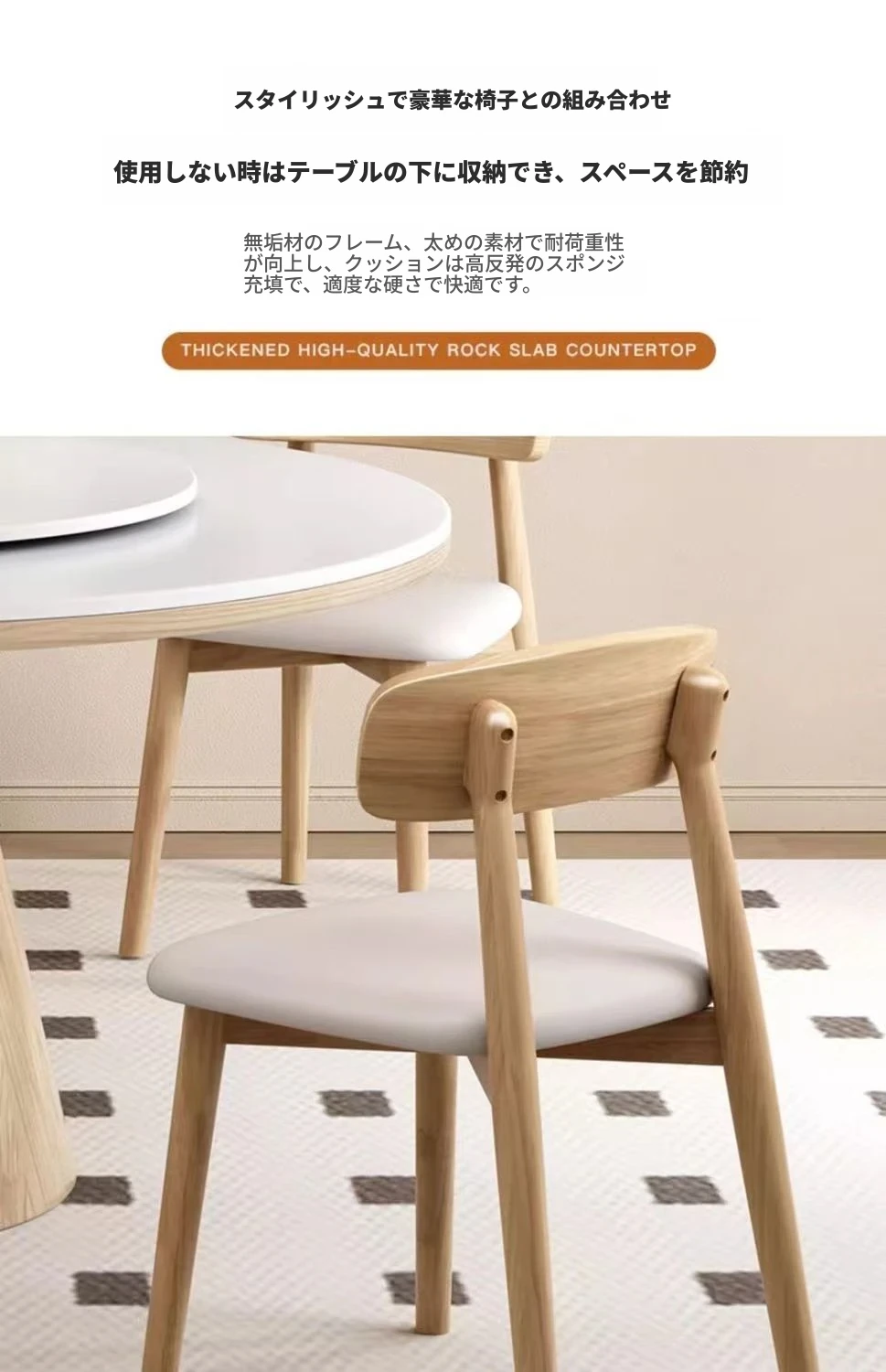 高級ストーンテーブルセット - 北欧風の円形ダイニングテーブル&チェア、回転盤付きのモダンなデザインで、シンプルな無垢材使用。おしゃれで機能的な家族の食卓に最適!