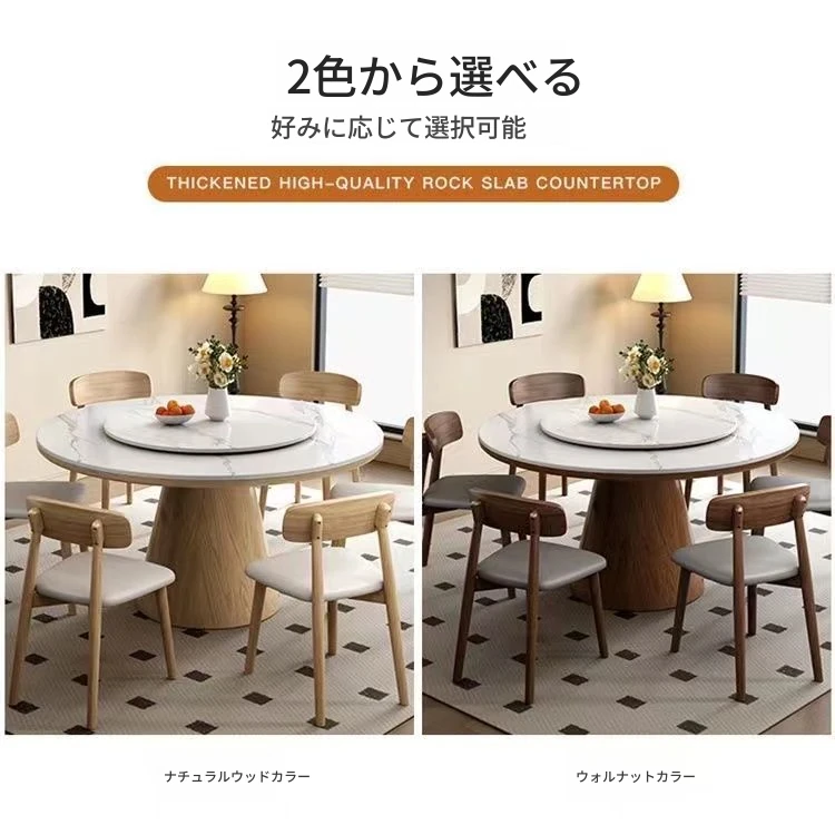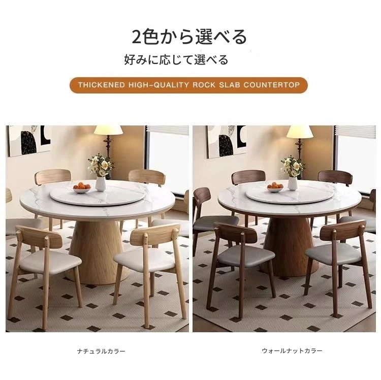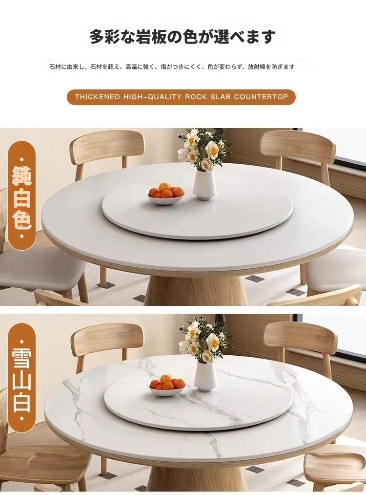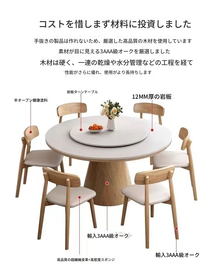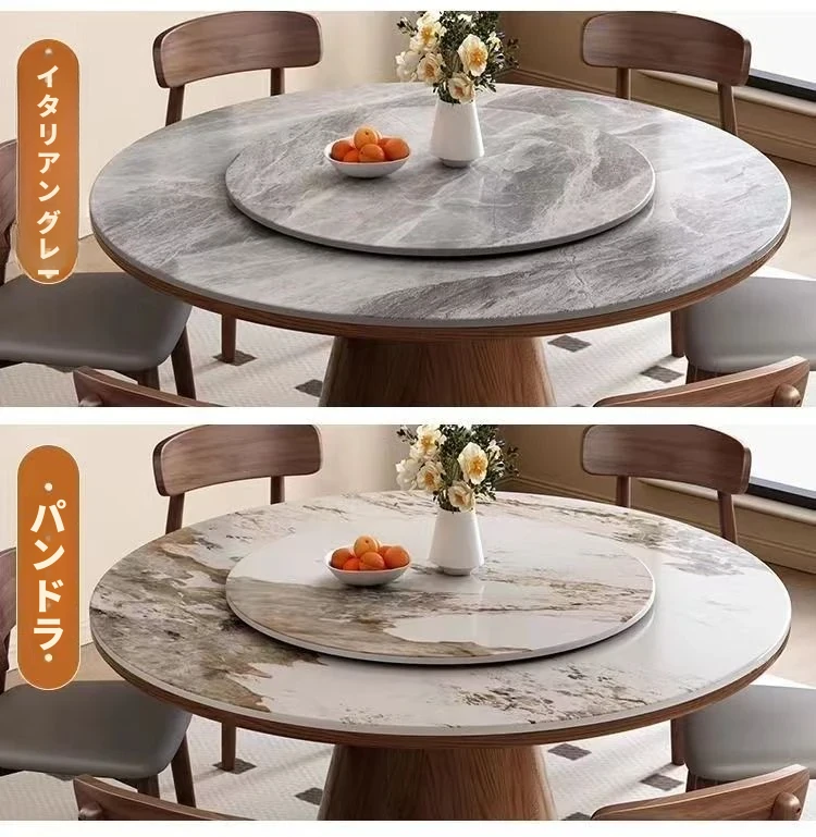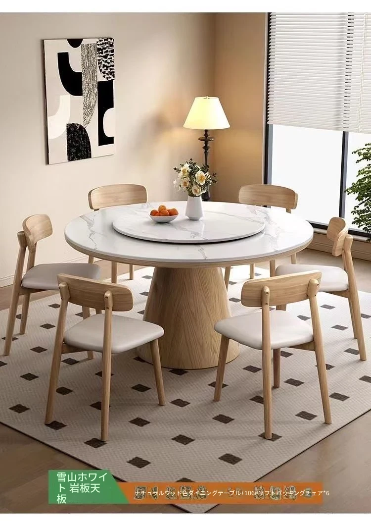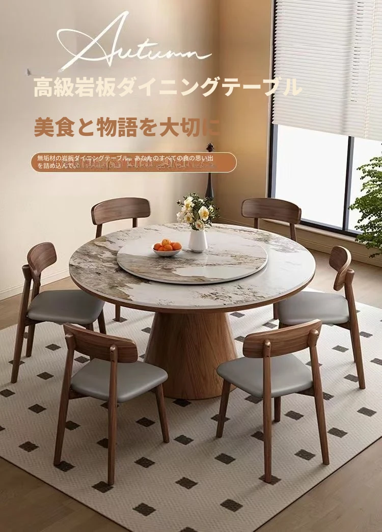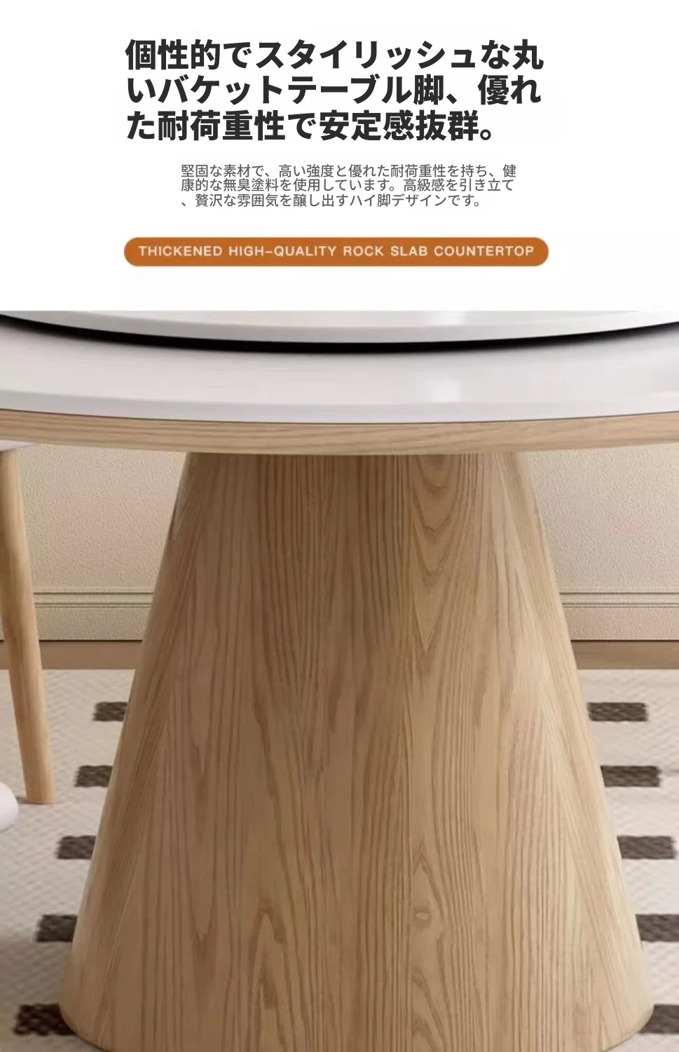 高級ストーンテーブルセット - 北欧風の円形ダイニングテーブル&チェア、回転盤付きのモダンなデザインで、シンプルな無垢材使用。おしゃれで機能的な家族の食卓に最適!