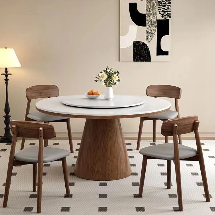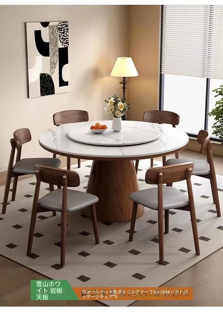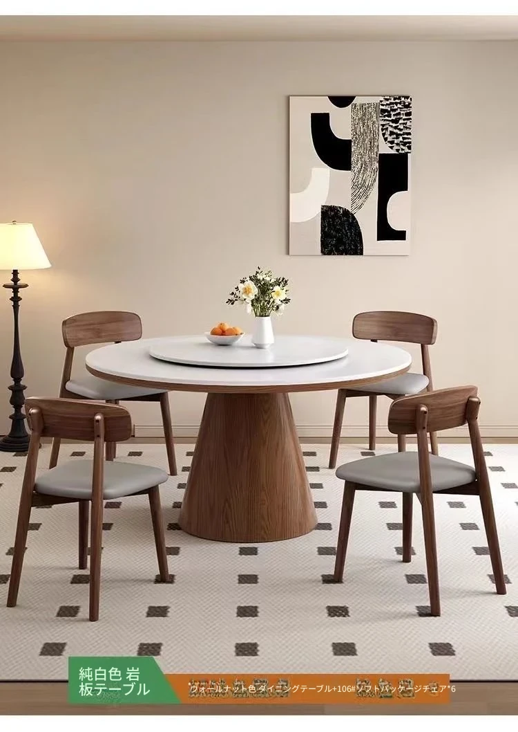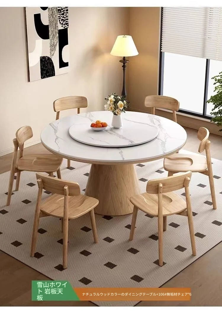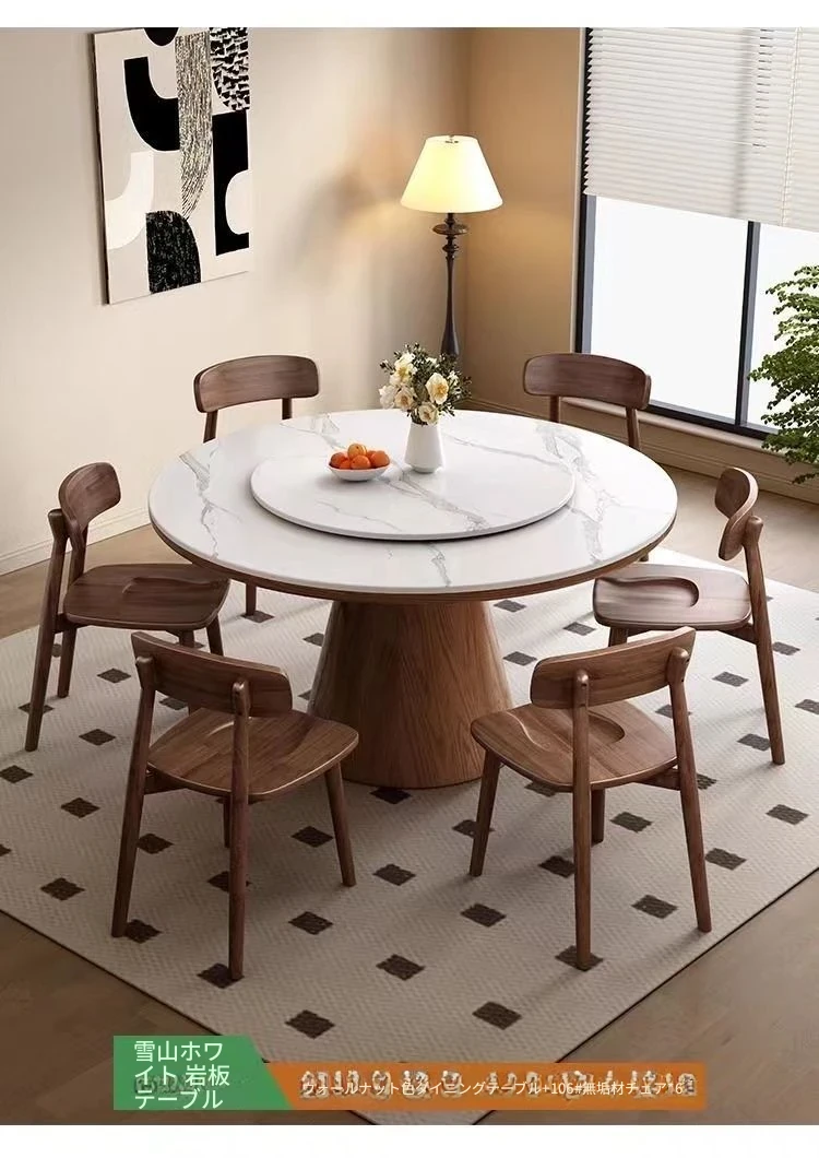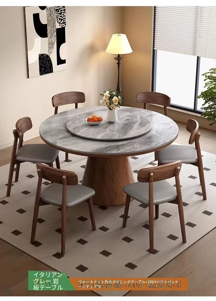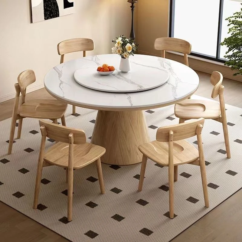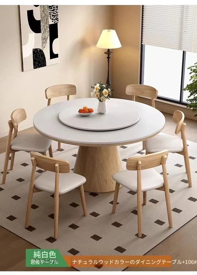 高級ストーンテーブルセット - 北欧風の円形ダイニングテーブル&チェア、回転盤付きのモダンなデザインで、シンプルな無垢材使用。おしゃれで機能的な家族の食卓に最適!