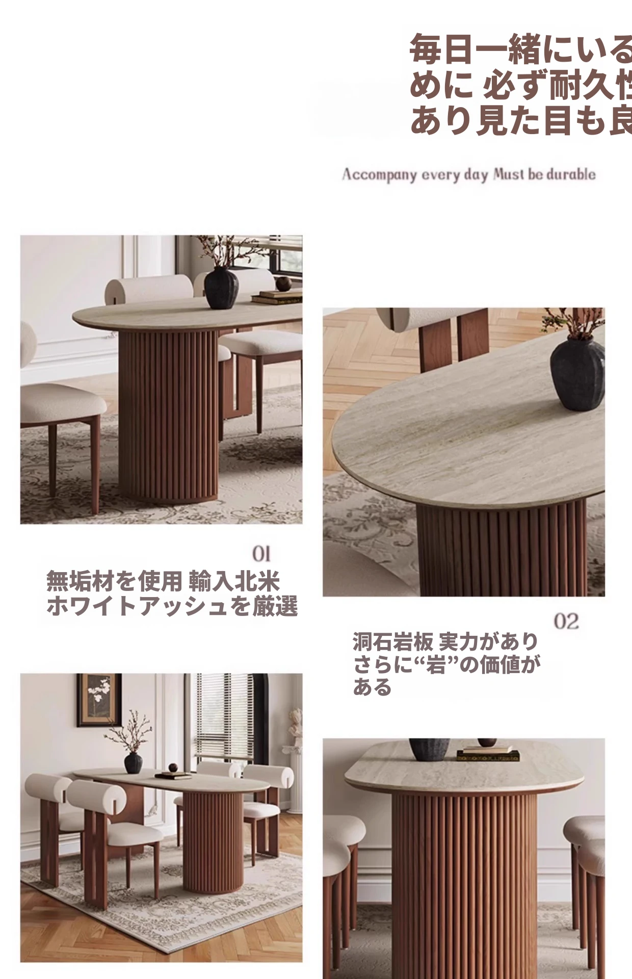 洞石の岩板テーブル+カバ椅子*4